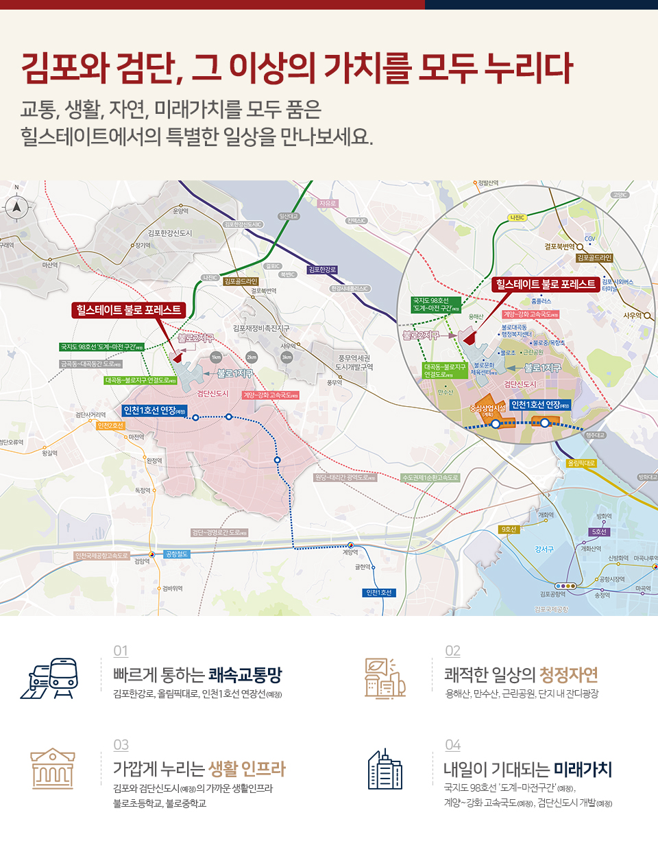 힐스테이트 검단 웰카운티 4.5억, 제일풍경채 검단 2차 4.7억, 검단역 금강펜테리움 더 시글로 5억 원 정도였던 분양가를 비교해보면 2~7천만 원 정도 오른 분양가도 경쟁률을 떨어트리지만 입지를 자세히 보면 검단신도시의 가장 큰 교통호재라고 할 수 있는 인천 1호선 연장선의 프리미엄을 보기 어려운 단지로 보입니다. 검단신도시 중심 상업지구를 누릴 수 있고 불로초 도보 10분대, 불로중 도보 15분대로 통학이 가능합니다. 지하철은 도보로 이용이 어려워 보이지만 인천 1호선 연장선 예정과 대곡-불로를 연결하는 도로가 공사 중이며 검단-일산을 잇는 국지도 98호 선도 25년 준공 예정입니다. 이제 시작한 검단의 입주장은 27년까지 이어질 전망입니다. 이점을 고려하셔서 청약하셔야 할 것입니다. 힐스테이트 불로 포레스트 무순위 청약에 관심 있는 분이시라면 꼼꼼히 검토하셔서 청약하시길 바랍니다. 당첨이라는 행복을 이루시길 바랍니다.